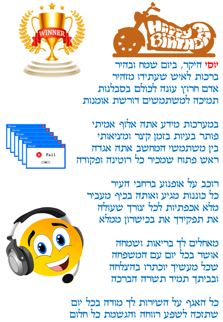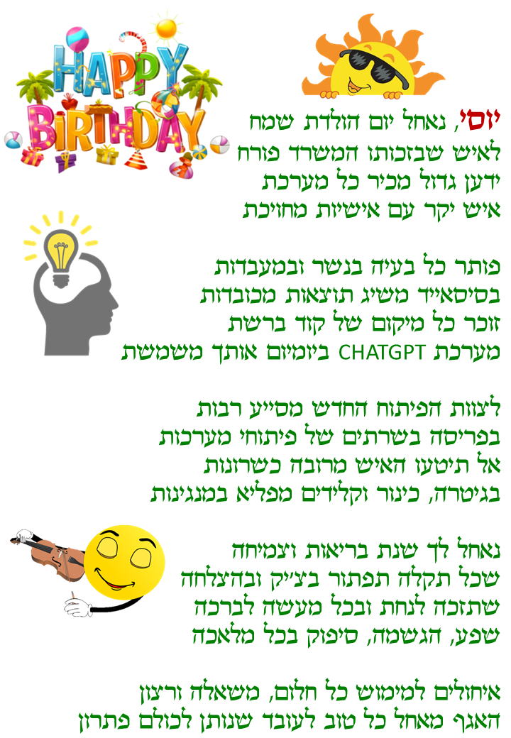 התהליך משלב אלמנטים אקטואליים, אירועים בחיי המקבלים ,עיסוקם ושאיפותיהם בחיים, כל זאת בחריזה שובבה ומרעננת שמפרגנת למקבל/ת ביום המיוחד שלהם.